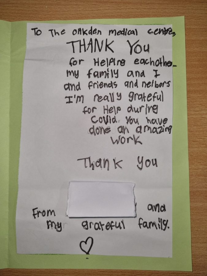 We had a very sweet little patient pop in the other day to drop of this lovely card, thanking the medical centre for all their care during the Covid pandemic.